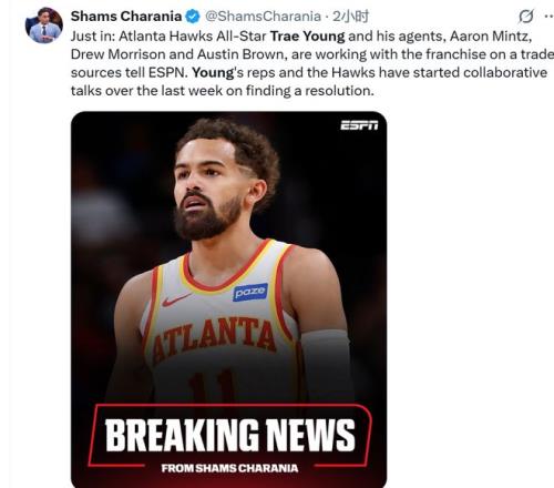 原文如下:據ESPN消息人士透露,亞特蘭大老鷹隊全明星球員特雷·楊及其經紀人阿隆·明茨、德魯·莫裏森和奧斯汀·布朗正在與球隊商討交易事宜。楊的經紀人和老鷹隊已於上周開始進行合作談判,力求找到解決方案。