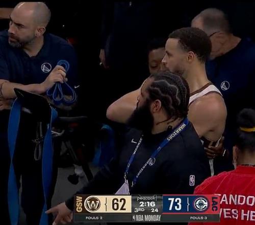 庫裏第三節下場時在球員通道拉伸背部的位置,庫裏疑似背部的肌肉有些不適,但庫裏還是決定在末節先登場帶隊追分。