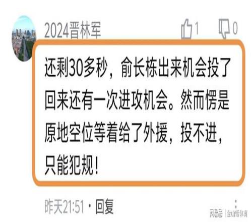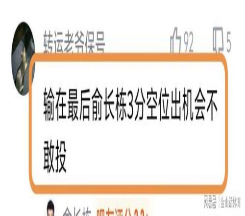 許多球迷質疑俞長棟的空位不敢投。“還剩30多秒,俞長棟出來機會投了回來還有一次進攻機會。然而愣是原地空位等著給了外援,投不進,隻能犯規!”;“輸在最後俞長棟3分空位出機會不敢投。”;“俞長棟真是牛,空位都不投。”……