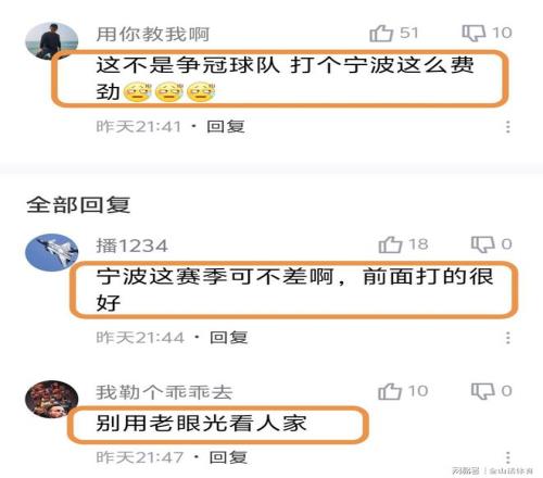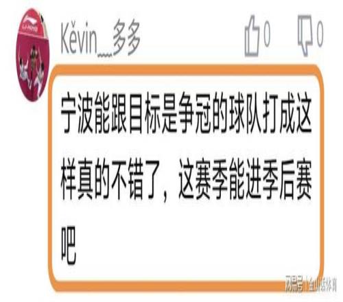 寧波隊雖然輸球,但卻贏得了眾多球迷的讚譽。“寧波這賽季可不差啊,前麵打的很好”;“別用老眼光看人家”;“寧波能跟目標是爭冠的球隊打成這樣真的不錯了,這賽季能進季後賽吧”;“咱就說寧波強不強吧”;“戰績在那,加油。”。“寧波今年打通任督二脈了?”……