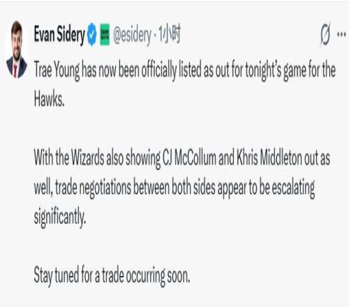 北京時間1月8日,就在名記Shams報道奇才成為特雷-楊的首選下家後不久,名記Sidery跟進指出,特雷-楊已被老鷹隊正式列入今日比賽的缺席名單。與此同時,奇才隊也宣布CJ-麥科勒姆、米德爾頓、基斯珀特也將缺席今日的比賽。種種跡象表明,兩隊圍繞特雷-楊的交易談判正顯著升級。