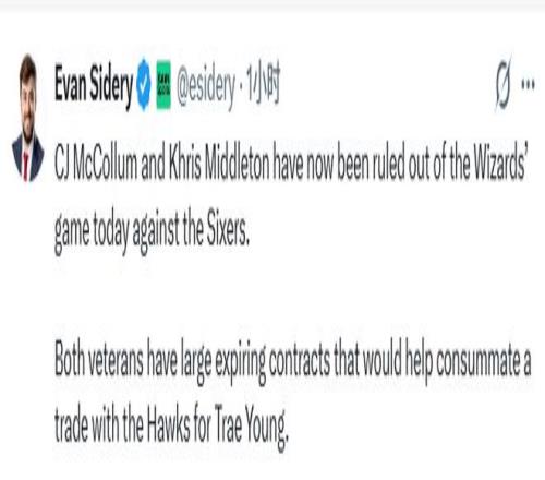 Sidery還表示,一筆交易或將很快達成。奇才的麥科勒姆和米德爾頓這兩位老將均持有大額到期合同,這將有助於促成奇才與老鷹關於特雷-楊的交易談判,使薪資匹配更具可行性。