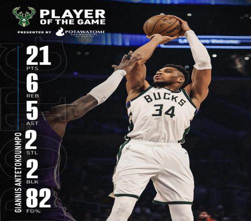 雄鹿隊,小波特14中7砍下了22分5板6助4斷,得分和搶斷領跑全場,在攻防兩端發力。庫茲馬10中5得到13分3板2助、波蒂斯12中5,三分球5中1得到11分12板3助、AJ·格林7中4貢獻11分2板2助2斷。羅林斯13中2,三分球7中1得到10分6板2助,在進攻端瘋狂打鐵。特納8分6板、特倫特6分2板2助、哈裏斯3分2板1助。