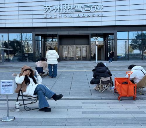 尚未開業,蘇州熱雪奇跡門口已有不少直播分銷達人在售票。圖:記者 秦李欣/攝
