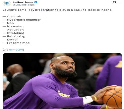 戴夫-麥克梅納明透露過41歲的詹姆斯為了出戰背靠背兩場比賽有多麽的自律:冷水澡、高壓氧艙、小睡、玩一會遊戲、冰敷膝蓋45分鍾、拉伸、康複治療、力量訓練、賽前餐。