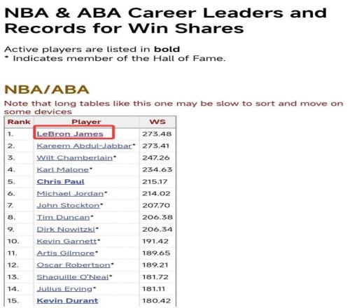 這場比賽後詹姆斯的常規賽Winshare(勝利貢獻值)已經超過天勾賈巴爾登頂曆史第一,詹姆斯是273.48,賈巴爾273.41,接下來勒布朗的每一場比賽都會刷新勝利貢獻值曆史新高,他再度成為行走的紀錄產生儀。