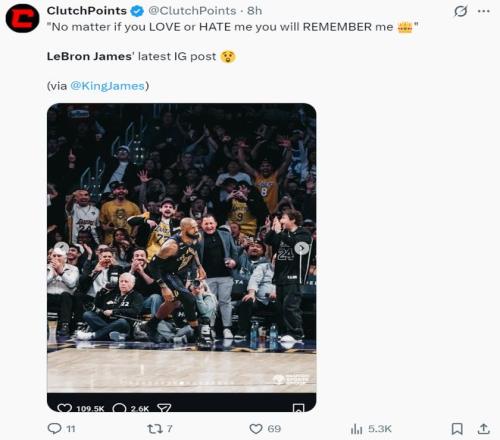 幾小時前勒布朗在個人IG更新了一句話:不管你是愛我還是恨我,但你一定會記住我。(他發布的是對陣老鷹比賽的圖)老頭也知道很多人還在罵他,但他根本無所謂。