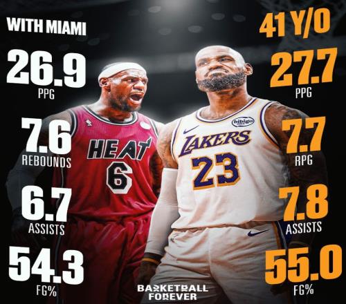 年滿41周歲後,勒布朗場均27.7分7.7籃板7.8助攻1.3搶斷0.3蓋帽,命中率55%,誰能想到41歲的勒布朗比熱火27-28的勒布朗數據還要出色一點?