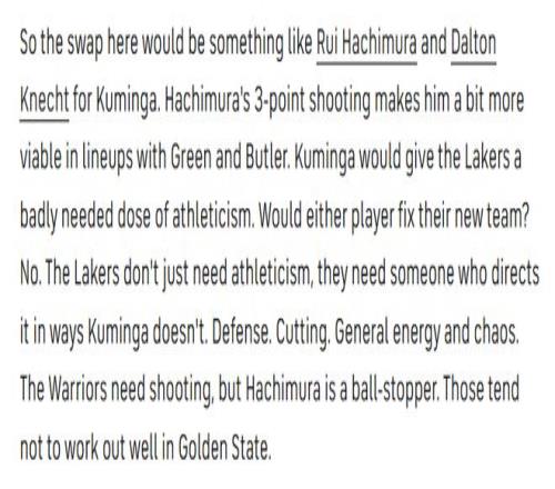 湖人不會放棄選秀權,也不會接手長期合同。如果他們要做交易動作,本質上不過是換湯不換藥——用隊內的到期合同去換取其他球隊的到期合同,當然,最好是能補充球隊現有陣容所欠缺的技術特點的球員。而庫明加的合同下賽季為球隊選項,實際上等同於一份到期合同。