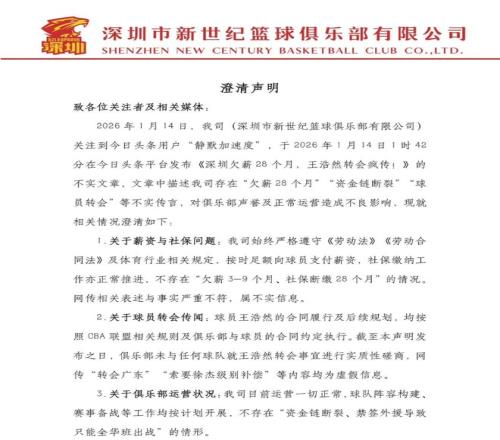 1月14日,深圳男籃更新官方賬號,回擊了不良自媒體關於俱樂部“欠薪”和“球員轉會”等謠言。