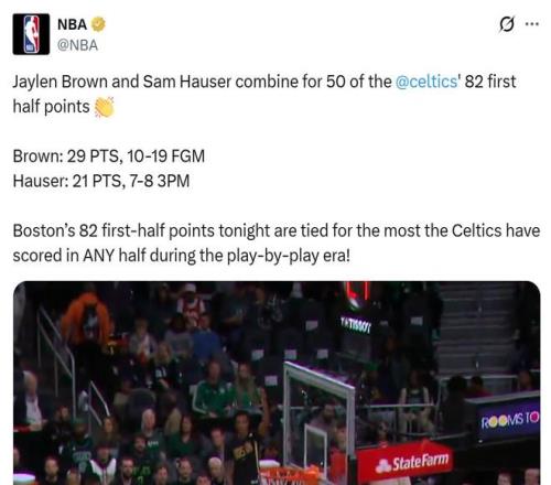 第二節拿下52分讓凱爾特人半場轟下82分,不僅創造本賽季球隊上半場得分紀錄,也是引進實時解說以來凱爾特人隊史半場最高得分紀錄。