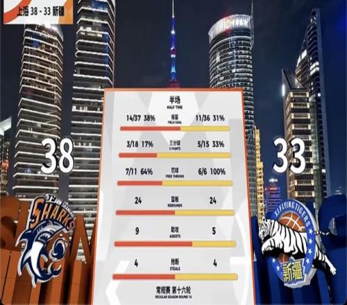 隨後大鯊魚外援古德溫開始發力,大號三分命中吹響球隊反攻的號角,古德溫這一節4投全中,獨砍11分。在他的帶領下,上海男籃打出一個11比0,反超比分。而新疆男籃第二節19次出手僅僅投進5球。大鯊魚單節打出25比16,在半場結束時以38比33領先5分。
