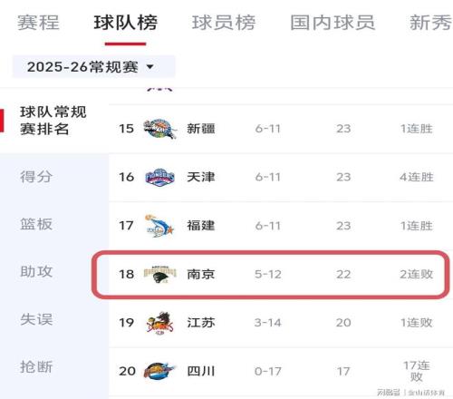 值得一提的是,本賽季開打前,南京同曦官方社媒公示,球隊原主帥貝西洛維奇由於家庭原因主動辭職,原助教、前浙江隊主帥王世龍接替成為球隊新任主教練。然而,王世龍接過教鞭後,並沒給這支“青年軍”帶來改變,球隊反而在開賽後一路走低,遇強則弱,遇弱不強,打誰都費勁吧啦,截止目前,同曦隊以5勝12負的慘淡戰績,排名積分榜倒數第3位。