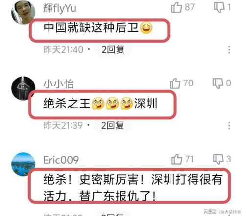 23歲的小外援史密斯,本賽季持續出色的發揮,以及本場比賽搶眼的表現,令網友們讚不絕口,紛紛留言道“這球太精彩了,看看人家的外援,北京選的什麽外援,差距太明顯了!”;“絕殺反絕殺,真精彩.”;“中國就缺這種後衛”;“絕殺之王,深圳!”;“絕殺!史密斯厲害!深圳打得很有活力!”;“最後一回合神仙打架,真特麽過癮”;“就看了個絕殺和反絕殺!!”;“把深圳這個小外援歸化吧,還年輕可以用很久。”……
