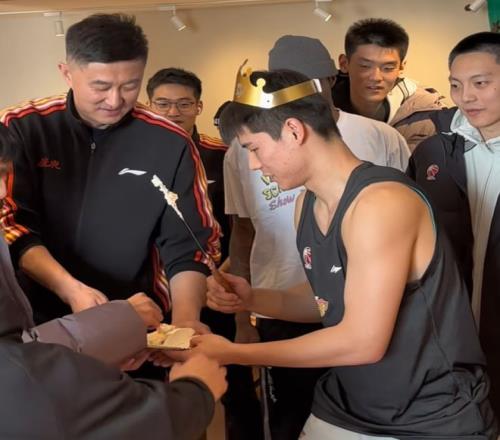 陳家政還專門拿了一塊蛋糕給杜鋒,這樣的待遇已經拉滿了。杜鋒在旁邊非常開心,因為陳家政是潛力球員,杜鋒一直都在給到他信任,必須要好好感謝下。
