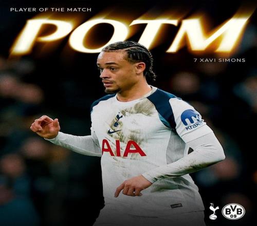 在與多特蒙德的歐冠聯賽階段第7輪比賽中,首發出戰並打滿全場的哈維-西蒙斯完成5次射門,為全場最多,此外還創造1次機會,貢獻3次搶斷,2次過人1次成功,10次地麵對抗6次成功,幫助熱刺以2-0的比分擊敗對手。