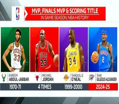 雷霆隊當家球星亞曆山大在上賽季完成了個人榮譽的大豐收,他收獲了常規賽MVP、總決賽MVP以及常規賽得分王的稱號。轉播方也整理了曆史上曾單賽季同時得到這三項榮譽的球員。