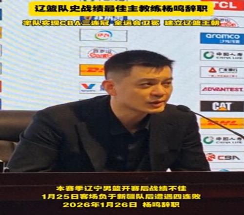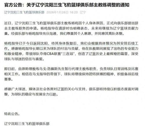 1月26日,遼寧男籃俱樂部官宣楊鳴由於身體原因辭去了主教練一職。