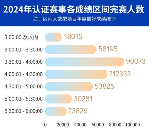 隨著後續路跑賽事的極速發展,比賽場次、比賽規模、大眾成績都大幅上漲。據中國路跑藍皮書顯示,2024年馬拉鬆賽事共有254場(認證賽事為180場),總規模為116.64萬人次(認證賽事規模為100.3萬人次),最終認證賽事中完賽人數為34.54萬人,其中破三人數為18015人(其中男子17275,女子740)人,相較2023年破三的11897人,增加了6118人。據不完全統計,2025年中國馬拉鬆全馬破三總人數約為2.5萬-2.8萬人。