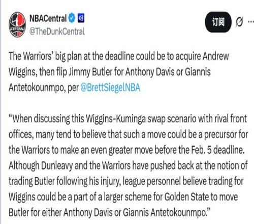 北京時間1月29日,據名記布雷特-西格爾報道,勇士隊在交易截止日的計劃可能分為兩步:先通過交易得到安德魯-維金斯,再用吉米-巴特勒作為籌碼,去換濃眉或字母哥。