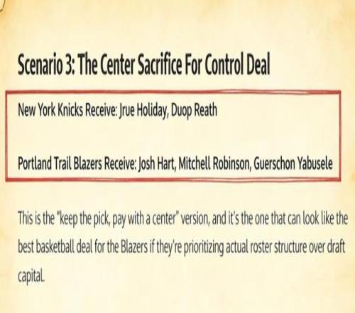 美媒《Fadeaway World》則撰文提出了一套3換2的交易方案,建議尼克斯送出哈特、羅賓遜和亞布塞萊,從開拓者引入霍勒迪以及裏斯。