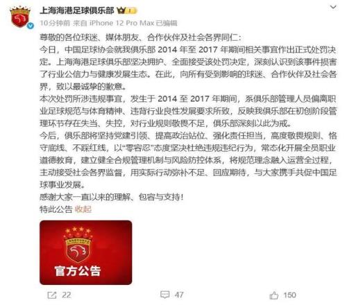 隨後,上港也在俱樂部官方社交賬號上發文,稱俱樂部堅決擁護、全麵接受足協的處罰決定。強調所涉違規事宜發生於2014年至2017年期間,是俱樂部管理人員偏離職業足球規範與體育精神、違背行業良性發展要求所致。上港表示,將以“零容忍”的態度堅決杜絕違規違紀行為,常態化開展全員職業道德教育,用實際行動彌補不足,回應期待。
