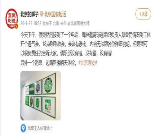 北京時間1月29日,北京國安球迷代表“北京的暉子”在社媒發文稱,自己下午接到電話,作為球迷組織負責人,受邀參與了國安俱樂部召開的有關此次扣分事件的會議。