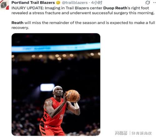 除了戈登,今天還有個比他還慘的“倒黴蛋”,開拓者隊的內線杜普 - 裏斯,遭遇了應力性骨折,這傷,就跟“定時炸彈”似的。開拓者官方都發話了,裏斯已經做完手術,可這賽季是徹底“涼涼”了。這賽季裏斯打了32場,場均2.9分1.2板,這數據,就像小水花似的。開季初,他還跟楊瀚森在第三中鋒的位置上“爭得你死我活”,可隨著賽季推進,他慢慢就變成純外線炮台了,這倆人的戰術位置,就跟兩條平行線,沒啥競爭關係。而且他倆上場時間都不多,在場下那叫一個親密,勾肩搭背地聊天,就跟多年未見的老友似的。