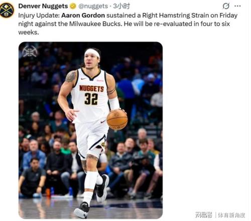 NBA今天公布了兩則傷病消息……頭一則,掘金隊的阿隆 - 戈登,右腿筋“傷上加傷”,又要開啟4 - 6周的“養傷假期”!這賽季,戈登的右腿筋就像個調皮鬼老是出問題,這已經是他第二次“搞事情”了。上回戈登缺席,還是在11月呢,當時他直接“躺平”了19場比賽。這次就算樂觀估計,休養一個月就能“滿血複活”,可等他回來,NBA常規賽都進入最後一個月“倒計時”啦!
