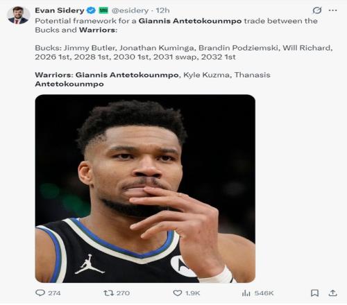 《福布斯體育》記者埃文-斯迪瑞透露,勇士隊除了能送出4個首輪簽外,他們2031年的首輪互換權也可以用於交易揚尼斯,而如今的難點在於如何配平薪資。