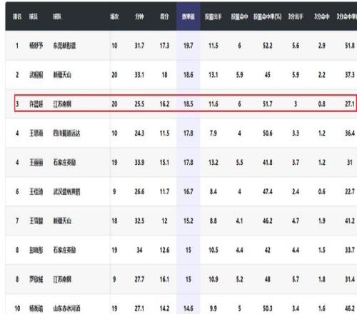 在本土球員籃板榜上,許晨妍以場均搶到6.9個籃板排名第一。在本土球員效率值榜上,楊舒予以19.7排名第一,武桐桐18.6位居第二,許晨妍18.5排名第三,王思雨和王麗麗都是17.8並列第四。很顯然,許晨妍是本賽季效率值最高的中鋒。相比之下,陳明伶效率值13.7排名本土球員第14位。劉禹彤效率值13.2排名本土球員第16位。