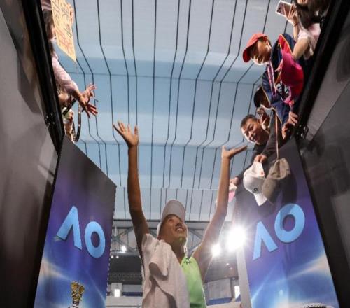 張帥在賽後與觀眾互動。 當地時間1月29日,在墨爾本進行的2026年澳大利亞網球公開賽女雙半決賽中,張帥(中國)/梅爾滕斯(比利時)2比0戰勝柴原瑛菜(日本)/茲沃納列娃(俄羅斯),晉級決賽。 新華社記者 馬平 攝