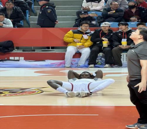 球員一味的賽場熱身,對於球員來說也是等待的略微枯燥,包括法耶已經躺在了地板之上,一直等待著比賽開場,可謂十分悠閑,賽場觀眾也是等待的喊起了退票。