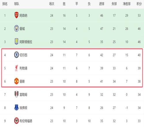 本場利物浦順利拿到3分,再加上切爾西也逆轉西漢姆,英超積分榜的形勢也發生了變化。2大豪門已經反超了曼聯,其中切爾西殺進前四,利物浦位居第五。接下來,曼聯將在主場迎戰富勒姆,如果能擊敗對手,他們就將重新回到前四的位置。