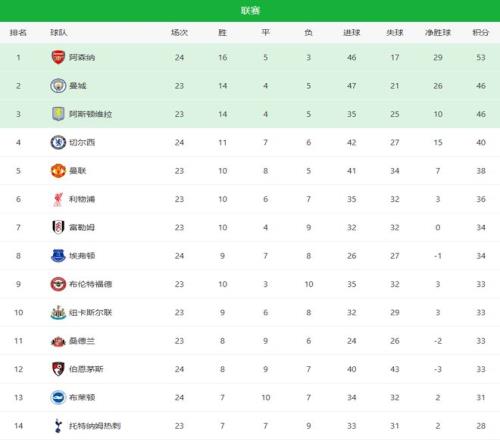 隨著切爾西32逆轉+阿森納40!英超最新積分榜:曼聯被擠出前四_24直播網