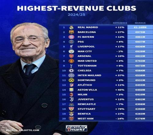 最近德國轉會市場引用德勤的數據,發布了“2024/25賽季收入最高的俱樂部”排名:皇馬以11.6億歐元排第1,巴薩9.75億歐元排第2,拜仁8.61億歐元排第3,巴黎8.37億歐元排第4;緊隨其後的是利物浦第5、曼城第6、阿森納第7、曼聯第8。前幾名把門檻抬得很高,但榜單真正的衝擊點在於——同樣是頂級豪門之間的較量,名次不隻拚戰績,更拚俱樂部把“生意”做多大、做多穩。