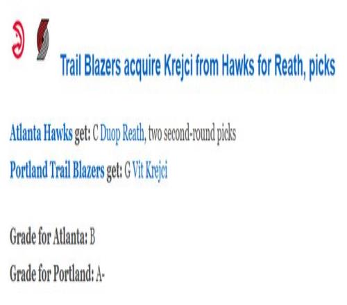 北京時間2月2日,開拓者和老鷹完成了一筆3換1的交易。開拓者送出已經賽季報銷的裏斯以及兩個次輪簽(原屬於老鷹的2027年次輪簽以及尼克斯的2030年次輪簽),從老鷹得到射手克雷伊奇。ESPN隨後對這筆交易進行評級,開拓者評級是A-,老鷹是B。
