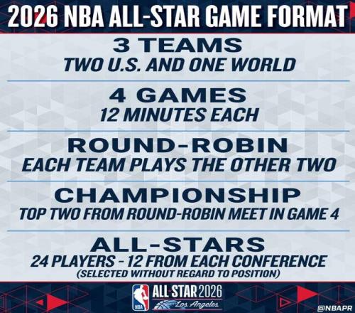 2026年NBA全明星賽正式改革,采用全新“美國隊VS世界隊”賽製。2026年NBA全明星正賽,兩支由美國球員組成的球隊是美國隊,外加一支由國際球員組成的球隊是世界隊,將采用循環賽製進行競爭,共包括四場12分鍾的比賽,這三支球隊每隊至少有八名球員。