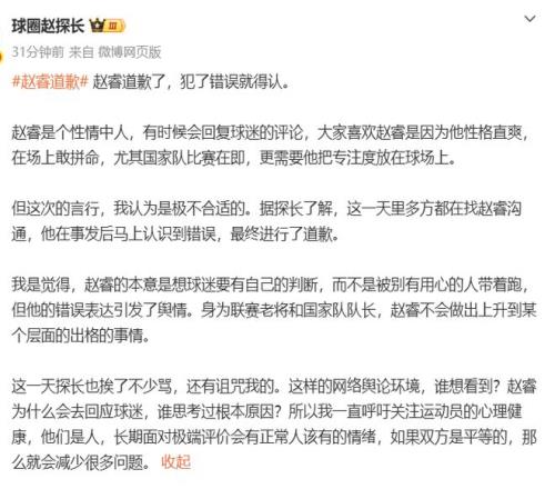 趙探長認為:趙睿犯了錯就得認,這一天多方都在找趙睿溝通,他已經意識到了錯誤,趙睿的本意是想球迷要有自己的判斷,而不是被別有用心的人帶著跑,但他的錯誤表達引發了輿情。