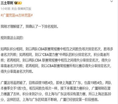 輸掉這一場後,山東提前無緣前四排位,本輪如果上海擊敗廣東(大概率事件),那麽上海在第一階段的積分將和廣廈齊平都來到42分,但廣廈卻依舊還是第一階段的榜首,據媒體人“三土帶刺”給出的消息,廣廈和上海賽季交手1勝1負,廣廈剛剛在潛力賽贏了吉林,積分來到21分,本輪上海和廣東沒有潛力賽可打,廣廈將憑借潛力賽積分優勢力壓上海,鎖定第一階段榜首。