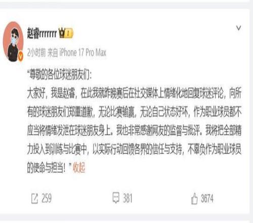 趙睿這波爭議言論影響非常惡劣,傷害了新疆球迷,2月2日晚,意識到事件嚴重性的趙睿,在個人社媒上發表了公開致歉,表示:“向所有的球迷朋友們鄭重道歉,無論比賽輸贏,無論自己狀態好壞,作為職業球員都不應當將情緒發泄在球迷朋友身上”。