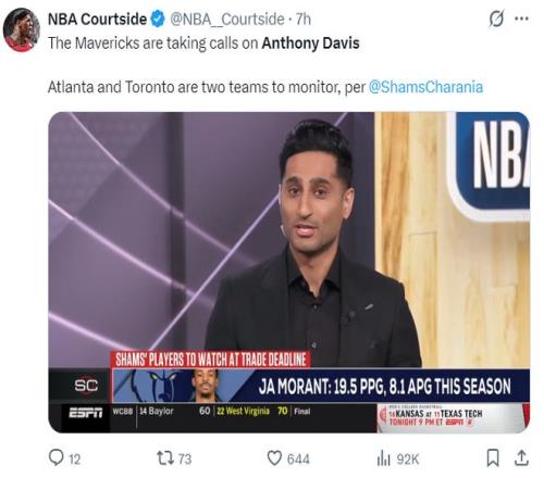 早些時候ESPN記者Shams在節目中表態,獨行俠正在積極的聽取安東尼-戴維斯的報價,聯盟已經有一些球隊跟獨行俠取得了聯係,重點關注的老鷹、猛龍兩支球隊。人獨行俠並沒有一定要在交易截止日前送走AD,球隊可以等到休賽期再決定,1月初AD遭遇的手部傷勢也減緩了交易的進程,因為他的價值正在縮水。