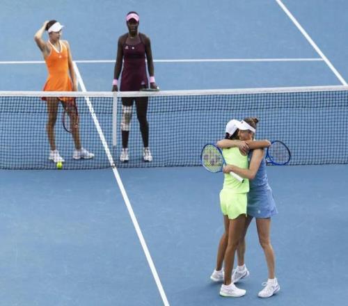 1月31日,張帥(後)/梅爾滕斯慶祝勝利。新華社記者 馬平 攝