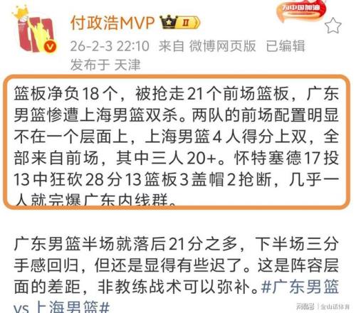 賽後,媒體人付政浩MVP社媒發文表示:籃板淨負18個,被搶走21個前場籃板,廣東男籃慘遭上海男籃雙殺。兩隊的前場配置明顯不在一個層麵上,上海男籃4人得分上雙,全部來自前場,其中三人20+,懷特塞德28分15籃板3蓋帽2搶斷,幾乎一人就完爆廣東內線群……