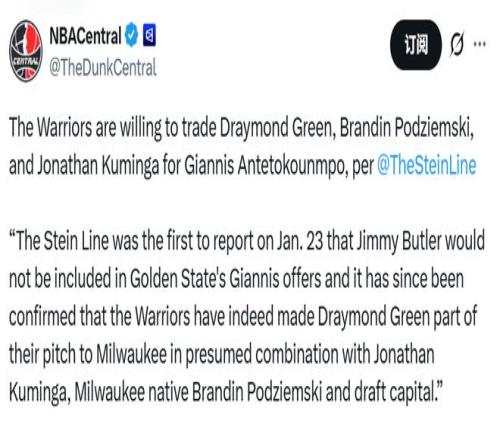 Stein表示:“1月23日香蕉视频网址已率先報道,吉米-巴特勒不會被納入勇士隊追逐字母哥的交易報價中。此後消息得到證實,勇士隊為說服雄鹿交易,已明確將德雷蒙德-格林納入交易方案,這份報價大概率還包含喬納森-庫明加、土生土長的威斯康星州密爾沃基人波傑姆斯基,以及若幹選秀資產。”