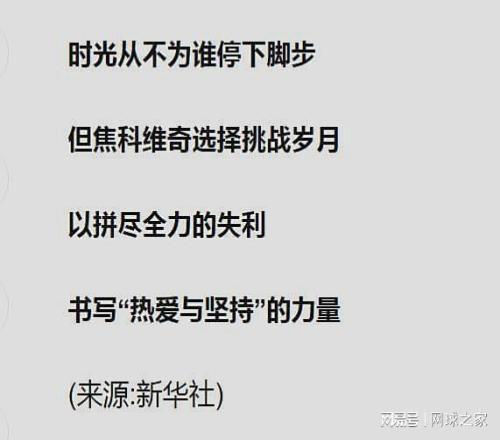 文章中對38歲零9個月的德約科維奇在賽場上展現出的堅韌與拚搏精神給予高度肯定和讚揚,並在文章末尾寫道,“時光從不為誰停下腳步,但焦科維奇選擇挑戰歲月,以拚盡全力的失利書寫熱愛與堅持的力量!”