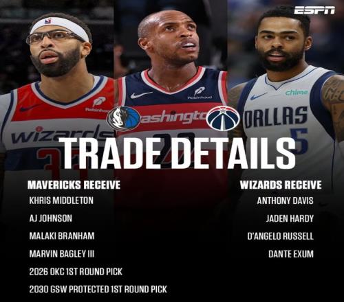 獨行俠與奇才的4換9大交易同樣震驚聯盟。安東尼·戴維斯被送往華盛頓,換回了米德爾頓、AJ·約翰遜以及2個首輪簽。具體交易信息如下: