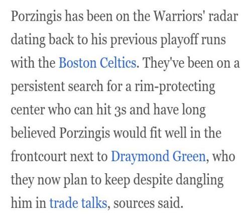 勇士隊記表示在波爾津吉斯為凱爾特人打季後賽時,勇士就盯上了他。勇士一直在尋找能護筐能遠投的中鋒,他們始終認為,波爾津吉斯非常適合與追夢格林搭檔內線,盡管此前曾把追夢放進交易籌碼,但現在勇士計劃留下這位功勳球員。
