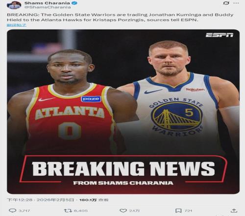 北京時間2月5日中午12點半,據NBA名記Shams報道,勇士連續達成兩筆交易:1、將庫明加、希爾德交易至老鷹,2換1得到波爾津吉斯;2、勇士將中鋒TJD送去猛龍,換回今年的1個次輪(來自湖人)!這兩筆加起來就是3換2!