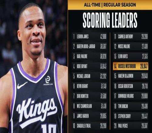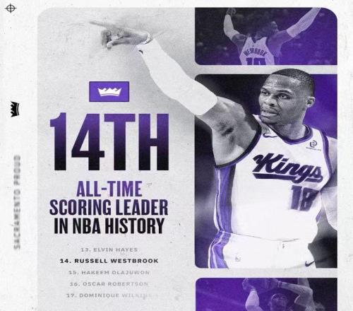 威少常規賽總得分超越火箭名宿奧拉朱旺,升至NBA曆史總得分榜第14位。